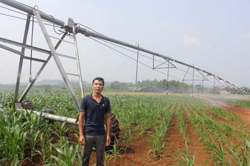 Đi sâu vào cánh đồng rộng vài trăm héc-ta có cánh tay tưới khổng lồ, tôi gặp một cán bộ trẻ, giới thiệu là Đinh Bá Hùng, nhân viên vận hành cánh tay tưới.
